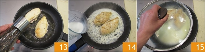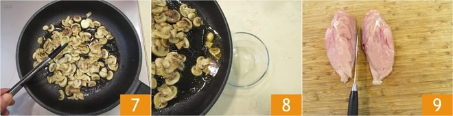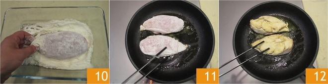 Retome a panela que você usou para os cogumelos, adicione um fio de azeite e aqueça. Passe os filés de frango na farinha 10 e transfira-os para a panela quente 11. Deixe-os dourar por 3-4 minutos e depois vire-os 11 e deixe dourar do outro lado pelo mesmo tempo 12.