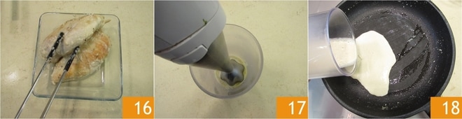 Uma vez cozidos, transfira os filés de frango para um recipiente 16 e bata o creme 17 para obter uma consistência mais lisa. Recomendamos fazer esta operação porque, como há farinha, o creme pode ficar ligeiramente granulado, mas se preferir um resultado mais rústico, você pode pular esta etapa. Despeje novamente o molho na panela 18.
