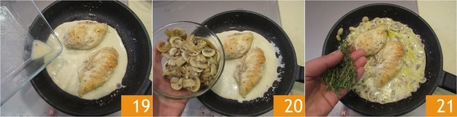 Adicione o frango 19 e os cogumelos 21. Junte também as folhas de tomilho 21 e cozinhe por mais 4-5 minutos.