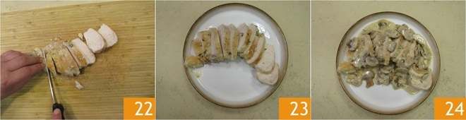 Passado esse tempo, pegue os filés de frango e corte-os em fatias 22. Transfira-os para um prato e regue com o molho e os cogumelos 24. Sirva bem quente.