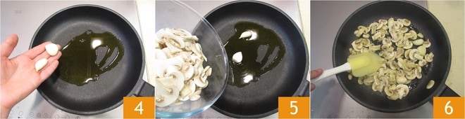 Em uma panela, coloque um fio de azeite, adicione os 2 dentes de alho 4 e deixe dourar. Junte os cogumelos 5 e misture bem 6.