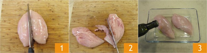 Para preparar o peito de frango com pimentões e azeitonas, primeiro corte o peito de frango em duas partes 1 e retire o osso e as partes gordurosas e fibrosas 2. Coloque os dois pedaços em uma travessa e tempere de ambos os lados com sal, óleo 3 e pimenta-do-reino.