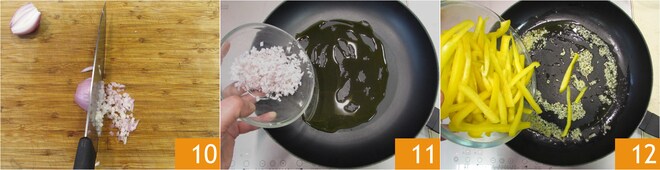 Pique também a cebola finamente 10. Agora pegue uma frigideira grande, coloque um fio de óleo e a cebola 11, refogue por cerca de 5 minutos em fogo baixo. Acrescente os pimentões (amarelos e vermelhos ou apenas amarelos dobrando a quantidade), cozinhe por cerca de 10 minutos 12.