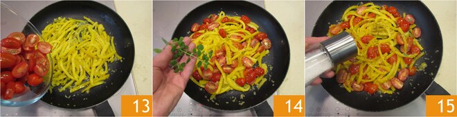 Adicione os tomatinhos 13. Tempere com sal e pimenta, perfume com as folhas de manjerona 14 e deixe cozinhar em fogo baixo por cerca de 10-15 minutos. No final do cozimento, ajuste o sal, se necessário 15.