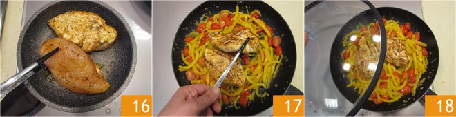 Pegue outra frigideira antiaderente. Coloque um fio de óleo e aqueça bem. Doure os peitos de frango de ambos os lados 16. Transfira para a frigideira com os pimentões e os tomates, cubra com uma tampa 17 e deixe cozinhar por cerca de 15-20 minutos. Verifique o cozimento e vire o frango 4-5 vezes. A tampa serve para não deixar o peito de frango secar, se estiver secando, adicione um pouco de água.