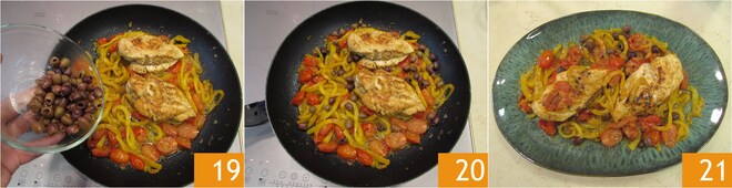No final do cozimento, adicione também as azeitonas 19 e o peito de frango com pimentões e azeitonas está pronto para ser servido 21.