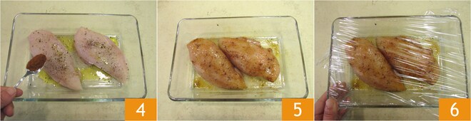 Tempere também com páprica doce 4 e massageie bem o frango 5. Cubra com filme plástico e deixe marinar na geladeira enquanto continua com a receita 6.