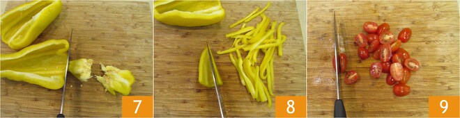 Lave os vegetais, corte os pimentões ao meio, remova os filamentos e sementes internas 7 e corte-os em tiras 8. Divida os tomatinhos ao meio 9.