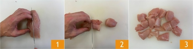 Para preparar o peito de frango empanado com palitos, corte o peito de frango primeiro em tiras 1 e depois em cubos de cerca de 3 cm 2 3.