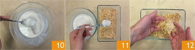 Escorra o excesso de massa pegando o frango com um garfo 10 e transfira-o para a empanagem de palitos 11. Ajude-se com as mãos para cobri-lo completamente 12.