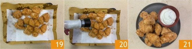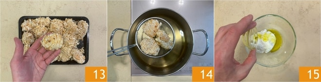 Continue desta forma até empanar todos os pedaços de frango 13. Aqueça o óleo a uma temperatura de 170°-180° e mergulhe alguns pedaços por vez para não baixar a temperatura do óleo. Vire-os de vez em quando até que fiquem bem dourados; isso levará cerca de 8-10 minutos, dependendo do tamanho deles. Enquanto isso, prepare o molho de acompanhamento: em uma tigela coloque o iogurte grego e o óleo 15.
