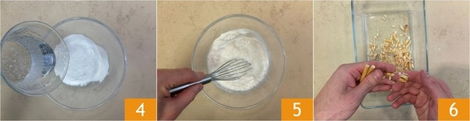 Passe para a massa: em uma tigela coloque a farinha de arroz e a água com gás fria 4. Misture bem com um batedor 5 até obter uma massa sem grumos. Agora pegue os palitos e esmigalhe-os à mão 6.