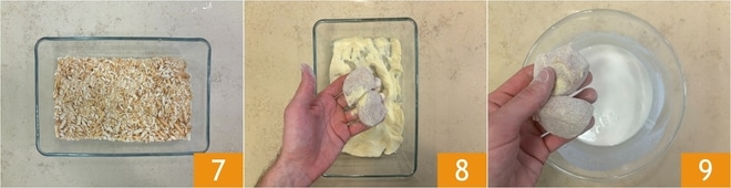 Você deverá obter uma empanagem grosseira 7. Neste ponto, passe o frango primeiro na sêmola 8 e depois na massa 9.