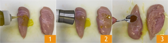 Para preparar o peito de frango na fritadeira a ar, primeiro cuide da carne: limpe os peitos de frango, depois tempere com óleo 1, sal 2 e páprica 3. Massageie bem para temperar uniformemente.