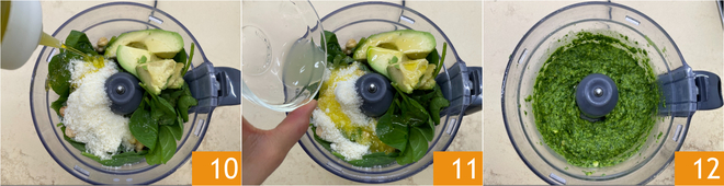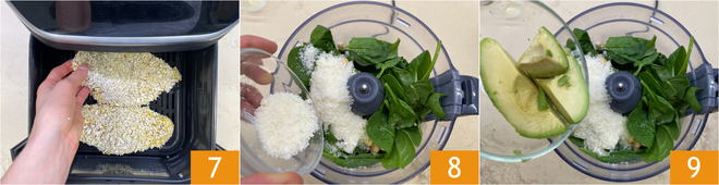 Coloque os peitos de frango empanados na fritadeira a ar (usamos uma fritadeira com capacidade de 6 litros) 7. Feche e cozinhe por cerca de 15-20 minutos a 180°. Enquanto isso, prepare o acompanhamento começando pelo molho para a salada: em um processador de alimentos, coloque os espinafres e as castanhas-de-caju, depois adicione o Parmesão ralado 8 e a polpa de abacate 9.