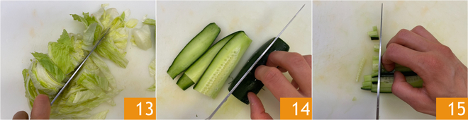 Agora, corte grosseiramente a alface 13. Corte os pepinos em fatias sem remover a casca 14, depois reduza-os a cubos bem pequenos 15.