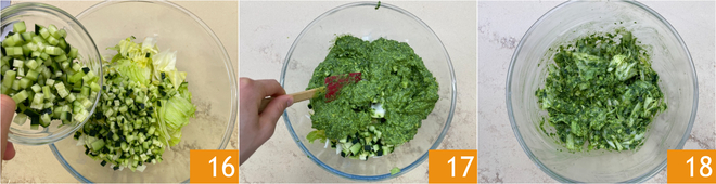 Junte a alface e os pepinos em uma tigela 16, depois despeje o molho e misture bem 17 para integrar tudo 18.