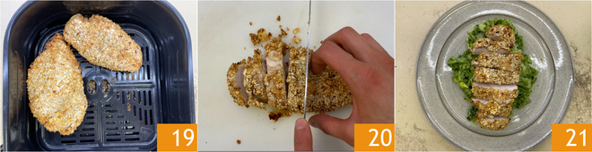 Enquanto isso, os peitos de frango estarão cozidos, devem estar crocantes e dourados 19, então corte-os em fatias 20. Emprate distribuindo o acompanhamento na base do prato, depois coloque o peito de frango na fritadeira a ar por cima e sirva 21!