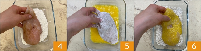 Passe os peitos de frango de ambos os lados primeiro na farinha 4, depois nos ovos batidos 5 e por último no panko 6.