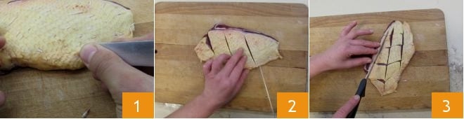 Para preparar o peito de pato laqueado com laranja, remova as pequenas penas ainda presas na pele dos peitos de pato com uma pinça de cozinha 1. Faça incisões nos peitos do lado da pele, realizando 3 cortes em diagonal 2 e 4 transversais para criar losangos 3.