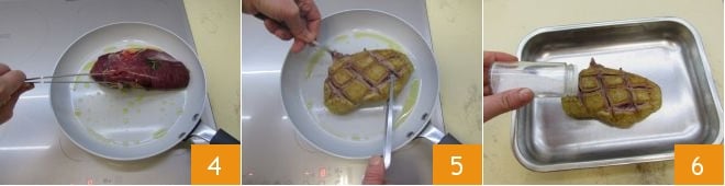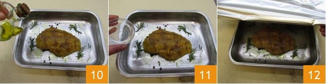 as folhas de alecrim, o óleo 10 e, por fim, despeje a água no fundo da assadeira 11. Cubra com uma folha de papel alumínio 12 e asse em forno estático pré-aquecido a 160°C por 30-40 minutos (ou a 130°C por 20-30 minutos, se em forno ventilado).