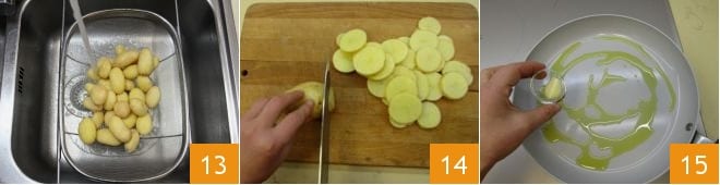 Enquanto isso, prepare as batatas: lave as batatas novas em bastante água corrente fresca 13. Com uma faca ou mandolina, corte-as em rodelas de 2-3 mm de espessura sem remover a casca 14, colocando-as à medida que as corta em um recipiente com água para não escurecerem. Quando terminar, doure um dente de alho descascado com um fio de óleo em uma panela antiaderente 15, depois escorra as batatas e seque-as com um pano limpo.