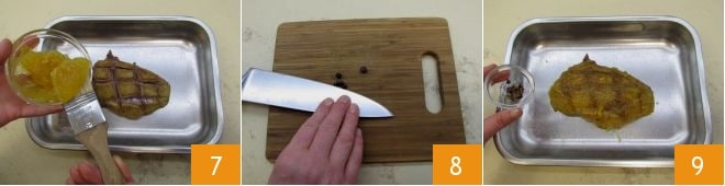 Coloque a geleia de laranja em uma tigelinha e depois pincele a pele dos peitos, cobrindo-os de forma uniforme 7. Com as costas de uma faca, esmague as bagas de zimbro, pressionando com as mãos 8; tempere os peitos com as bagas 9,