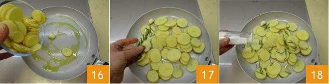 Quando o alho estiver dourado, coloque as batatas cortadas em rodelas no fogo 16 e cozinhe em fogo médio por 15 minutos, mexendo com uma colher de pau. Adicione algumas folhas de alecrim para dar sabor 17 e ajuste o sal 18.