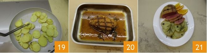 Uma vez prontas, remova o alho com uma pinça de cozinha 19. Após 30-35 minutos, verifique o cozimento da carne, cortando o centro do peito com uma faca ou verificando com uma sonda: neste caso, a temperatura deve ser de 71°C; se estiver abaixo, deixe o pato no forno e verifique novamente após 5-10 minutos. Quando estiver pronto 20, retire do forno e sirva: ofereça seu peito de pato laqueado com laranja, acompanhando com as batatas novas que preparou e algumas fatias ou gomos de laranja 21.