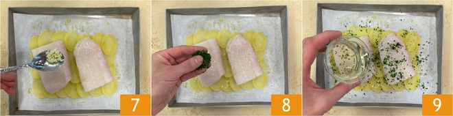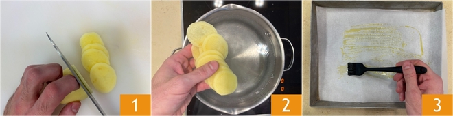 Para preparar o bacalhau assado com batatas, primeiro descasque as batatas e corte-as em fatias finas 1. Ferva as batatas em água salgada por 5 minutos 2, depois escorra. Enquanto isso, pique finamente o alho e forre 2 assadeiras com papel manteiga, pincelando a parte central com óleo 3.