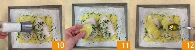 Ajuste o sal 10, depois cubra com mais batatas 11 e tempere novamente com uma pitada de sal e um fio de óleo 12. Faça o mesmo com a segunda assadeira.