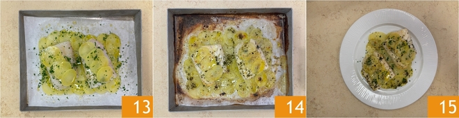 Complete com mais salsa picada e asse em forno estático preaquecido a 180°C por cerca de 25-30 minutos, até que as batatas fiquem douradas e o peixe bem cozido. Retire do forno 14 e sirva seu bacalhau assado com batatas bem quente 15!