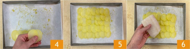 Pegue a primeira assadeira: coloque uma camada de batatas, sobrepondo-as ligeiramente 4, de modo a formar um retângulo grande o suficiente para acomodar 2 filés 5. Coloque o peixe por cima 6.