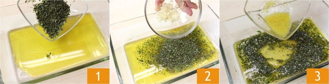 Para preparar o peixe-espada no papillote, comece pela marinada: em uma tigela grande, despeje o azeite de oliva extra virgem e as ervas aromáticas picadas 1, cuidando de reservar uma colher de sopa para adicionar no papillote. Adicione o alho picado 2 e o suco de meio limão junto com a casca ralada do limão 3.