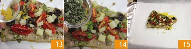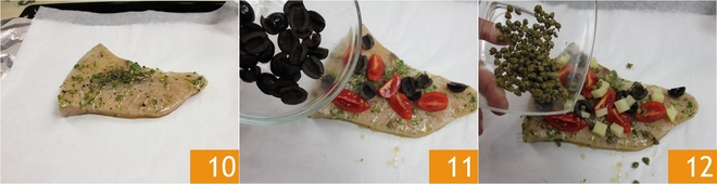 Em uma assadeira, prepare tudo para o papillote: estenda uma folha de papel alumínio, sobre ela uma de papel manteiga e, no centro, coloque uma das duas fatias de peixe-espada que você retirou da marinada 10. Comece a temperar o peixe com os vegetais cortados, as azeitonas 11 e as alcaparras, lavadas e espremidas 12.