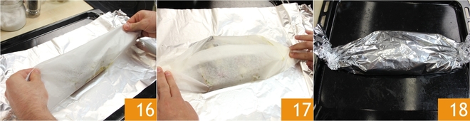 Aqueça o forno a 200º, feche os papillotes dobrando primeiro o papel manteiga no centro 16 e dobrando as laterais 17 e procedendo da mesma forma com a folha de alumínio 18. Cozinhe por pelo menos 25 minutos, verifique o cozimento do peixe-espada (depende da espessura da sua fatia, se necessário, deixe no forno mais 5 minutos) e depois retire do forno e coloque em dois pratos com seu próprio fundo de cocção!