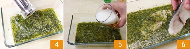 Sal e pimenta 4 e, por fim, adicione a cerveja de malte duplo 5. Mergulhe as fatias de peixe-espada na marinada 6 e deixe descansar por pelo menos uma hora ou, se preferir preparar com antecedência, durante toda a noite.
