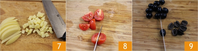 Enquanto isso, prepare os vegetais para o papillote: corte a batata em pedaços 7, os tomatinhos ao meio 8, a cebolinha e as azeitonas pretas 9.
