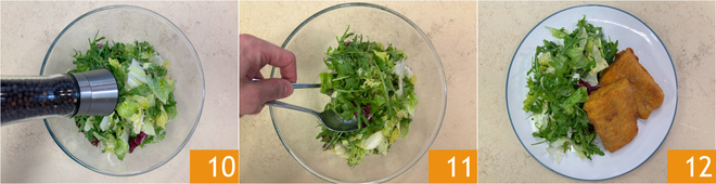 Adicione sal, pimenta 10 e misture 11. Seu bacalhau frito está pronto para ser servido com uma fresca salada 12!