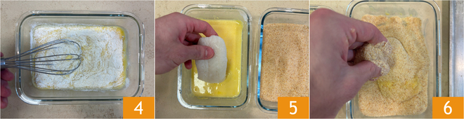 Misture bem para não formar grumos 4. Neste ponto, passe os filés de bacalhau primeiro na massa 5 e depois na farinha de rosca 6, pressionando bem para aderir.