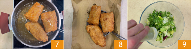 Aqueça o óleo de sementes em uma panela e frite poucos filés por vez por cerca de 10 minutos, virando-os na metade do tempo: eles devem ficar bem dourados e crocantes 7. Transfira para papel toalha para eliminar o excesso de óleo 8. Enquanto isso, prepare a salada e tempere com óleo 9.