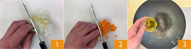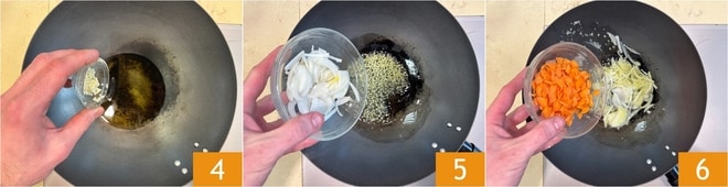 Adicione no wok o alho descascado e picado finamente 4, a cebola fatiada 5 e as cenouras picadas 6.