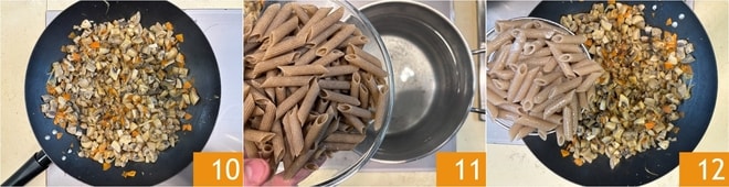 Continue cozinhando em fogo médio alto, mexendo frequentemente para evitar que os ingredientes na base do wok queimem 10. Cozinhe o penne de trigo sarraceno em água salgada fervente 11, uma vez pronto, escorra e transfira para o wok 12.
