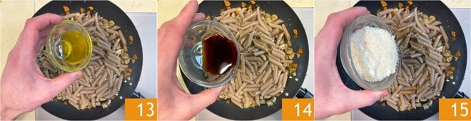 Para finalizar, despeje a outra metade do óleo 13, o molho de soja sem glúten 14 e o queijo parmesão ralado 15.