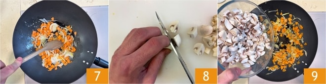 Mantenha a temperatura média alta e mexa com frequência usando uma colher 7. Como limpar os cogumelos porcini e corte-os em pedaços 8, em seguida, transfira-os para a panela junto com o restante do tempero 9.