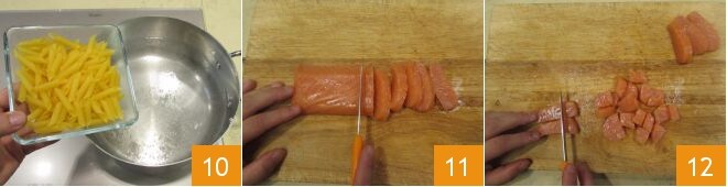 Enquanto isso, coloque no fogo uma panela com bastante água salgada e quando ferver, jogue a massa 10. Enquanto cozinha, cuide do salmão: coloque o filé na tábua de cortar, corte-o em fatias grossas 11 e delas faça cubos 12.