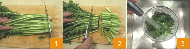 Para preparar suas penne com salmão defumado e chicória refogada, comece limpando a chicória: remova a base do maço 1 e, mantendo o maço unido, corte as folhas em pedaços de cerca de 3 cm 2. Coloque a chicória assim cortada em um escorredor e lave-a sob bastante água corrente 3, depois deixe escorrer.