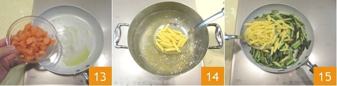 Em uma frigideira, aqueça um fio de óleo e, quando estiver quente, doure o salmão 13 apenas o tempo suficiente para ganhar cor. Quando estiver pronta, escorra a massa 14 e transfira-a para a panela junto com a chicória 15.
