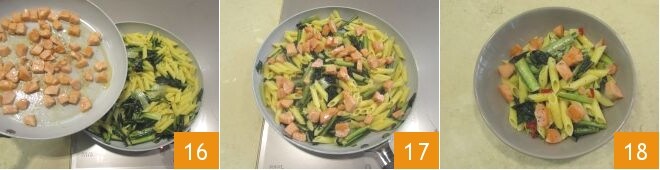 Adicione também o salmão dourado 16 e salteie por alguns segundos para misturar todos os sabores 17. As penne com salmão defumado e chicória refogada estão prontas para serem saboreadas 18!