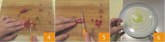 Enquanto isso, corte a pimenta fresca para remover as sementes e o cabo 4 e corte o restante em tiras finíssimas 5. Aqueça o óleo na panela e frite o alho descascado, inteiro 6 até começar a chiar bem. Nesse ponto, remova-o do refogado e adicione a pimenta.